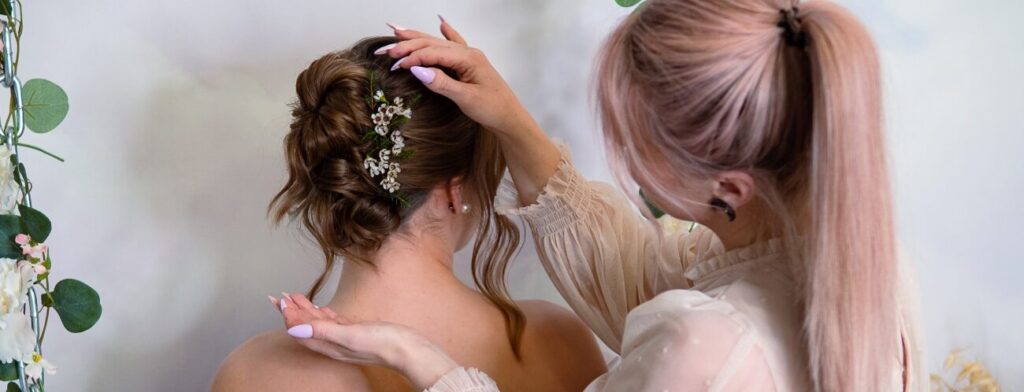 • Mikäli kampaukseesi tulee kukkia, suosittelen sinua pyytämään floristiasi laittamaan kukkien varsiiin rautalankaa sekä teippiä, jolloin kukat on helpompi asetella kampaukseen rikkomatta varsia.